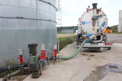Actuellement, l’ETA possède deux camions-citernes et s’apprête à en acheter un troisième. En effet, pour les chantiers les plus éloignés, l’entrepreneur est amené régulièrement à en louer un en complément. Les chauffeurs disposent donc du permis poids lourd. Chaque citerne est équipée d’une pompe à lobes pour l’aspiration dans la fosse. Quand le chauffeur arrive sur la méthanisation ou à la ferme, il connecte la pompe à un tuyau souple, relié à la fosse. Un capteur coupe automatiquement l’aspiration dès que la citerne est pleine. Puis, grâce au circuit pneumatique du camion, de l’air sous pression est envoyé dans le tuyau pour le purger avant le décrochage. Ceci évite de faire tomber du liquide au sol ou sur le véhicule. « Nous avons beaucoup réfléchi à la question de la propreté du chantier, souligne Julien Poque. Les méthaniseurs avec qui je travaille ont prévu une plateforme bétonnée pour le chargement et un nettoyeur à haute pression pour laver le camion si besoin. Quand le chauffeur arrive sur site, il lui faut moins de 15 minutes pour remplir la citerne et repartir vers le chantier. Le haut de chaque citerne est également équipé d’un cône pour le pompage direct par l’automoteur Oxbo. »