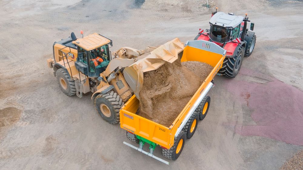 Les rétroviseurs bien réglés me confèrent une vue imprenable sur les côtés de la benne. Je constate que l’essieu suiveur forcé permet un braquage court, ce qui s'avère utile au passage de certains ronds-points plutôt exigus ! Point à surveiller, cependant : les pneus du tracteur et le timon de la benne dans les virages. Le MF 9S.425 étant équipé de pneumatiques de 900 mm de large, je dois veiller, dans les virages serrés, à ne pas frotter le pneu contre le timon. Après quelques minutes de route, me voilà sur site. Je me fraie un chemin au milieu des tas, des pelleteuses et des chargeuses. C’est alors l’occasion pour moi de faire mes premières manœuvres avec la benne. Je me positionne au pied du tas afin que la chargeuse Caterpillar 966K XE, de 325 ch tout de même, puisse remplir la benne. J'ai à peine le temps de dire « ouf » qu'en deux godets les 40 t de PTAC de l’ensemble sont atteintes.