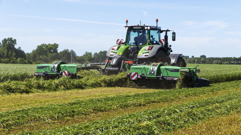 En complément de la faucheuse-conditionneuse frontale à disques XDF 351 SH, SaMASZ propose un groupe de fauche avec un papillon arrière de 9,1 m de largeur de coupe. Cette faucheuse-conditionneuse dénommée « KDD 911 STH » est compatible Isobus. Elle s’équipe de deux fauches arrière de 3,9 m et de tapis pour regrouper la matière en un seul andain central. Le suivi du sol est garanti par un système de décharge hydropneumatique soutenant l’ensemble des deux faucheuses. Les deux conditionneurs disposent de doigts de type « pied-de-biche » et projettent le flux de récolte sur les tapis à entraînement hydraulique. La KDD 911 STH a la particularité de travailler en signal de charge, via une connexion Power Beyond afin de disposer d’un fort débit hydraulique nécessaire à son bon fonctionnement.
